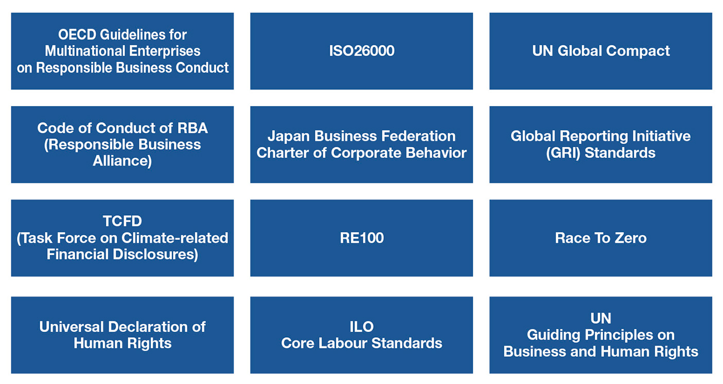 The Panasonic Group conducts its business in accordance with applicable legislation, as well as global standards, specifications, norms, guidelines, and various initiatives.