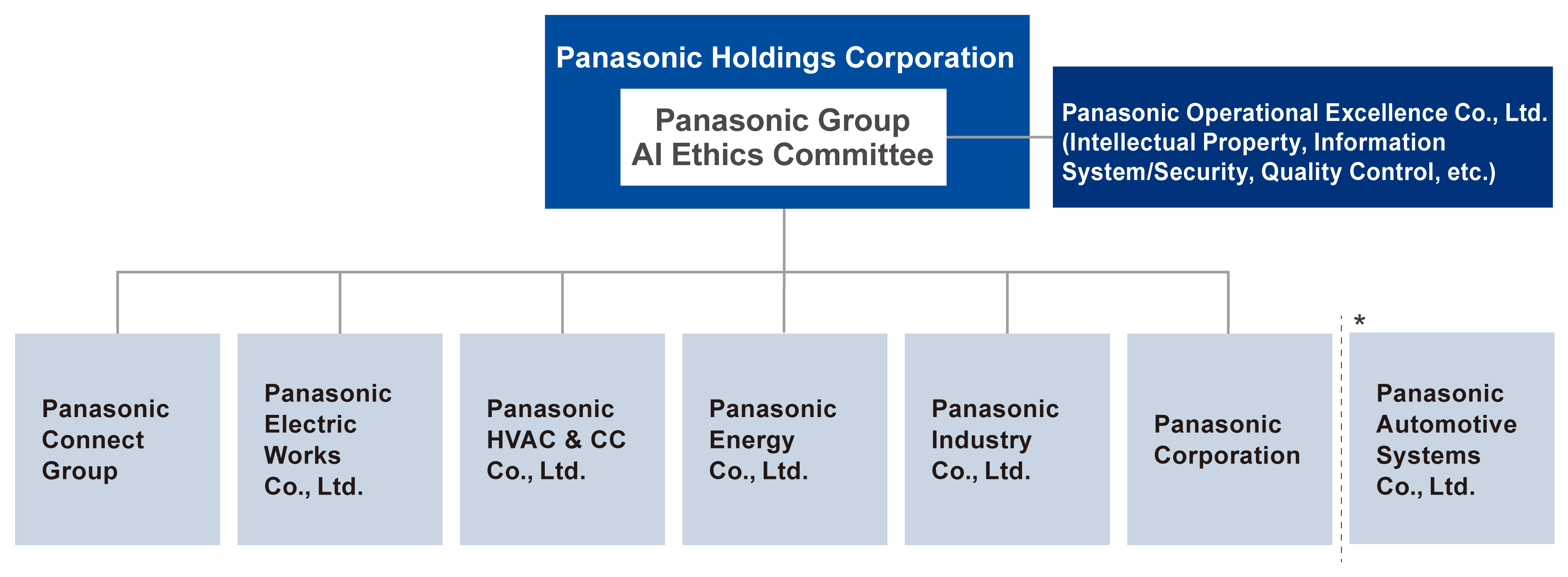The AI Ethics Committee has been established within the Panasonic Holdings Corporation by the Group CTO, comprising staff members in charge of AI ethics and members from other related departments. The Committee provides the Group with systems and measures to be implemented in relation to AI ethics activities and provides operating companies with support for their AI ethics activities as well as understanding, reviewing, and formulating countermeasures against risks. Each operating company also has persons in charge of AI ethics, and these individuals cooperate with the AI Ethics Committee to carry out activities that fit the business and technologies of each company.
