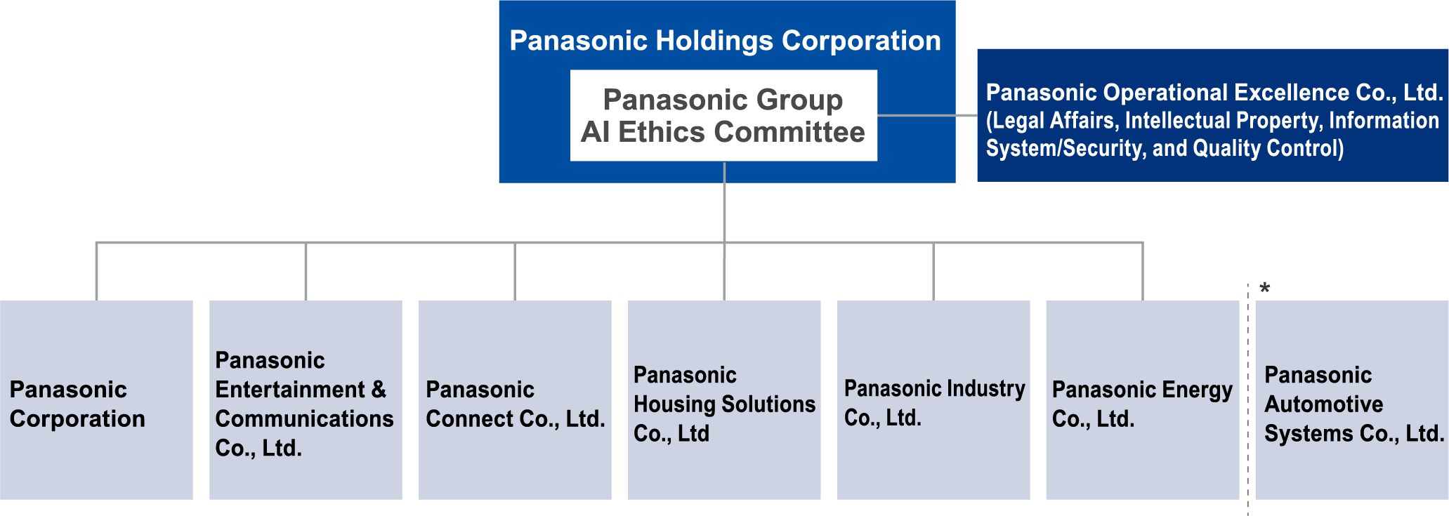 The AI Ethics Committee has been established within the Panasonic Holdings Corporation by the Group CTO, comprising staff members in charge of AI ethics and members from other related departments like legal and information security. The Committee provides the Group with systems and measures to be implemented in relation to AI ethics activities and provides operating companies with support for their AI ethics activities as well as understanding, reviewing, and formulating countermeasures against risks. Each operating company also has persons in charge of AI ethics, and these individuals cooperate with the AI Ethics Committee to carry out activities that fit the business and technologies of each company.