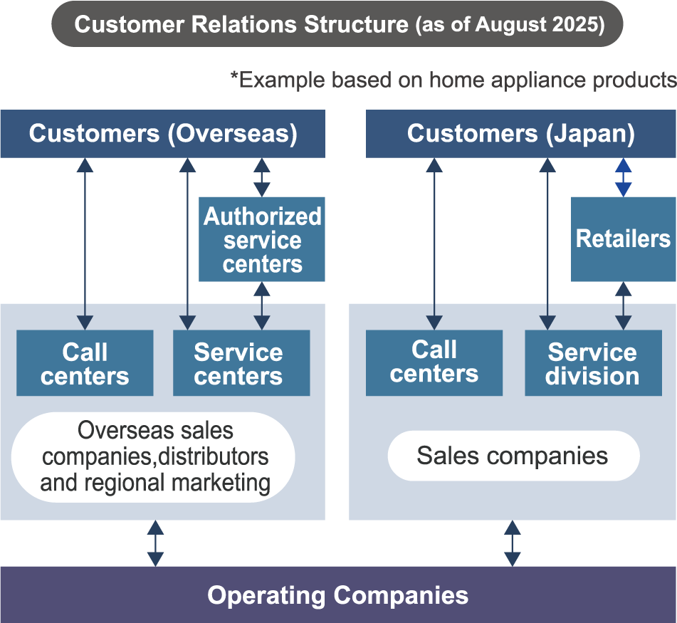 The CS departments at each of the 6 operating companies cooperate to implement the Group’s customer satisfaction initiatives. Overseas, the CS departments of Panasonic Group’s sales companies around the world collect local information concerning services and quality, as well as customer requests and so forth. This information is used to ensure the quality and safety of products and to help develop products that match the needs of customers in each department.