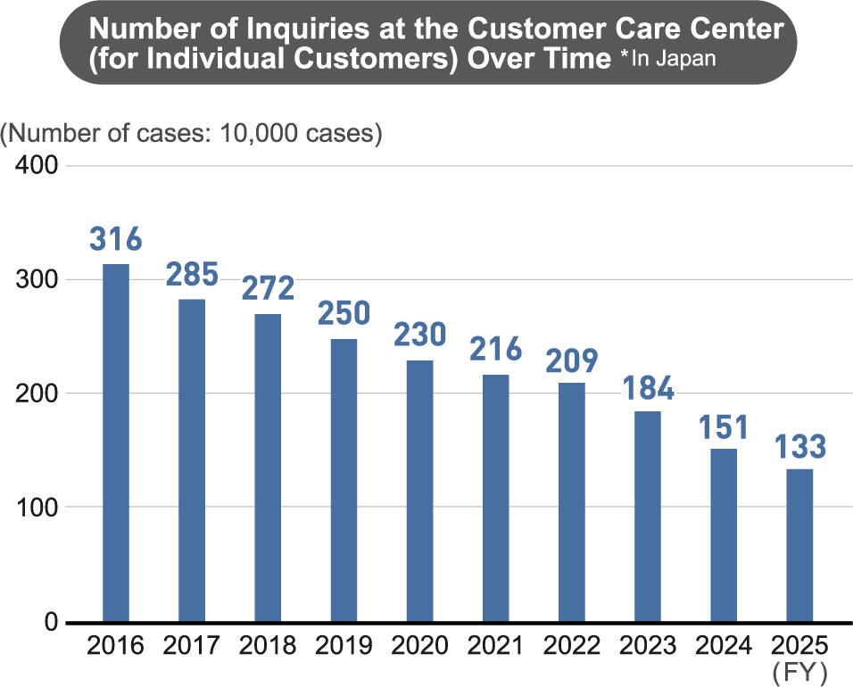When customers make inquiries on the Panasonic website by typing in a question, the site displays multiple relevant FAQs. Thus, the company strives to provide quick responses to questions. Regarding the content of its FAQ pages, the company analyzes the search keywords that bring customers to FAQs, as well as the number of times that the questions are viewed, to increase the precision of the FAQs, so that the information that customers require is accurate and displayed quickly. The company has also been undertaking initiatives to utilize Facebook and other social media platforms to post various types of helpful information in a timely manner, such as when the seasons change, and to entice customers to visit relevant FAQ pages using LINE’s autoreply service. Because these FAQs are organized so that customer’s problems can be solved without the customer needing to contact the Customer Care Center, the number of inquiries at the center is trending downward. Panasonic group sales companies and sales agencies operate call centers in each country/region outside of Japan as well, handling all types of inquiries as well as intake for repairs. The website for each country also includes FAQs, and we are working on building ways to allow customers to resolve their own issues as they are able to in Japan.