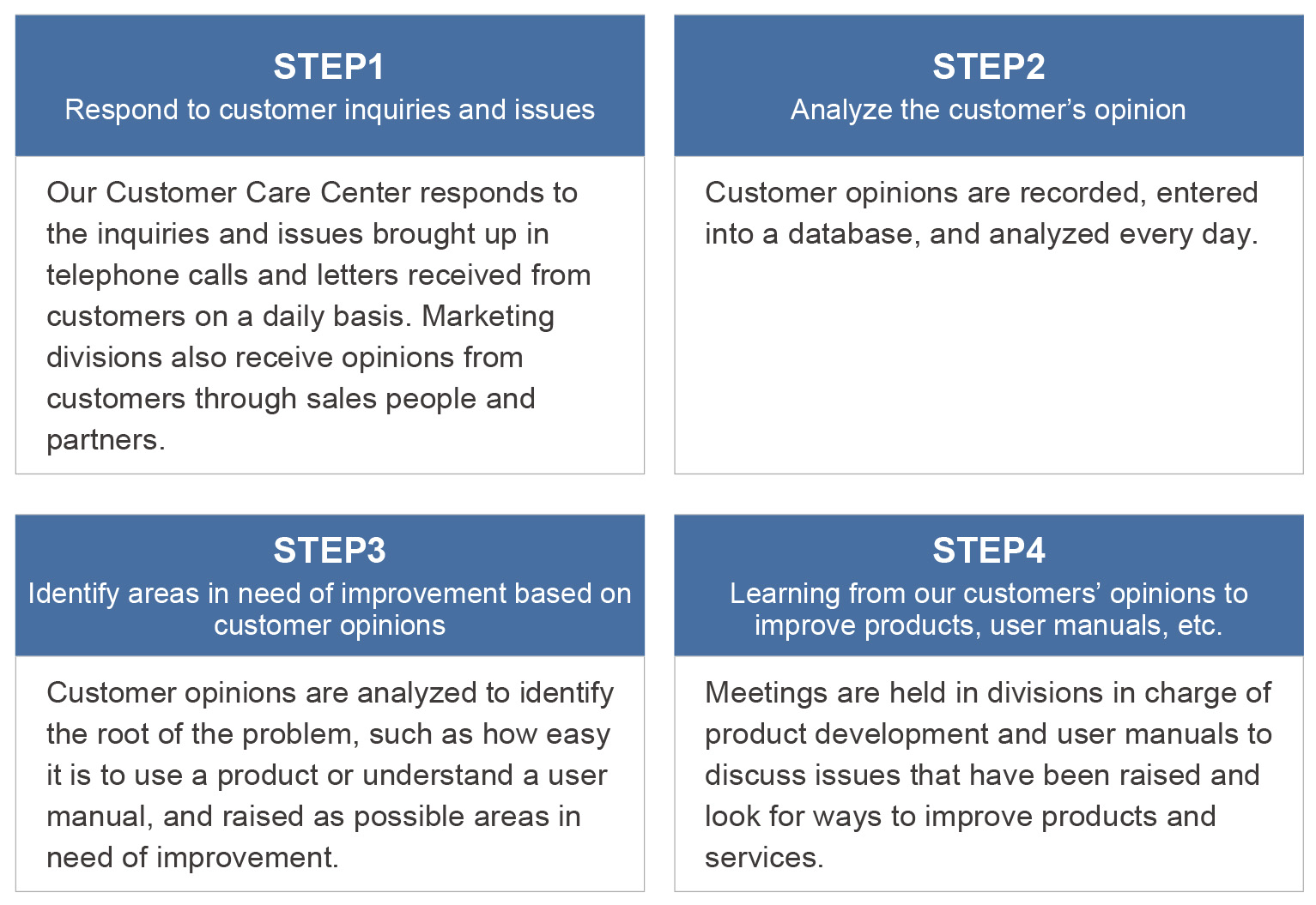 The voices of customers are heard via the opinions received through the Customer Care Center and Panasonic Group’s sales persons and partners, showrooms, and service companies. We use the results of these analyses for product development, functionality, quality, updates to instruction manuals and catalogs, and improvement of sales activities through a collaboration between product planning, design, technology, and quality control departments on one hand, and their marketing and sales departments on the other. Panasonic Group considers those VOC activities to be practical implementations of its Basic Business Philosophy, which aims to improve customer satisfaction. The company encourages all employees to engage with the voices of the company’s customers throughout various aspects of their work.