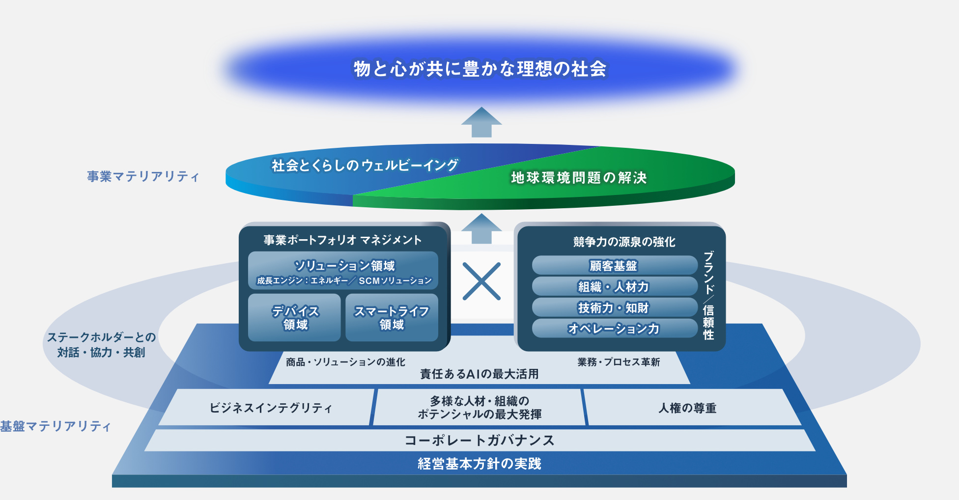 私たちは1918年の創業以来、「社会⽣活の改善と向上」と「世界⽂化の進展」の実現に向けて事業に取り組んでまいりました。これからも、物も心も豊かな「理想の社会」の実現に向け、社会課題に正面から向き合って、新しい価値を創造していきます。