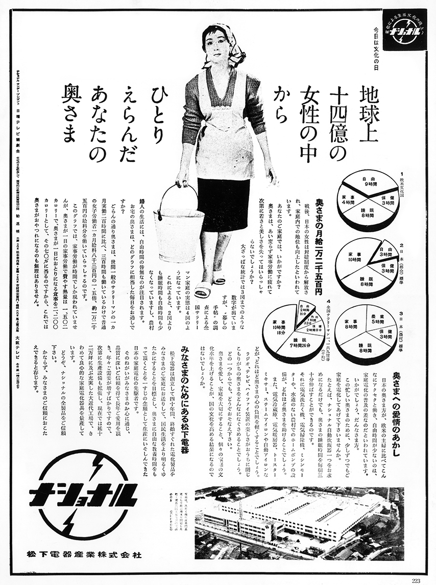 1957(昭和32)年、11月3日の「文化の日」の新聞に一風変わった広告が掲載された。くたびれた表情でバケツを運ぶ主婦と思しき女性を、「地球上14億の女性の中からひとりえらんだあなたの奥さま」という表題が囲み、本文では、日本の婦人が家事という賃金なき重労働に縛りつけられている実態が、データを基に証明されていく。そして「あなたの奥さま」を、そうした苦労から解き放つのが家庭電化であり、家庭電化が進んでこそ日本の文化レベルも向上する、と話は展開する。実は同年9月、松下幸之助は、ある講演会で次のように語っていた。「日本には婦人解放運動というものがあります。婦人の人格を認めて、できるだけ解放し、生活を楽しんでもらわなければならないという思想が湧いております。しかし、口でなんぼ言うてもダメです。時間を十分とってもらうには、やはり家庭電化ということが婦人解放運動そのものだと思うんです」。ここから、この「文化の日」の広告が生まれたのである。