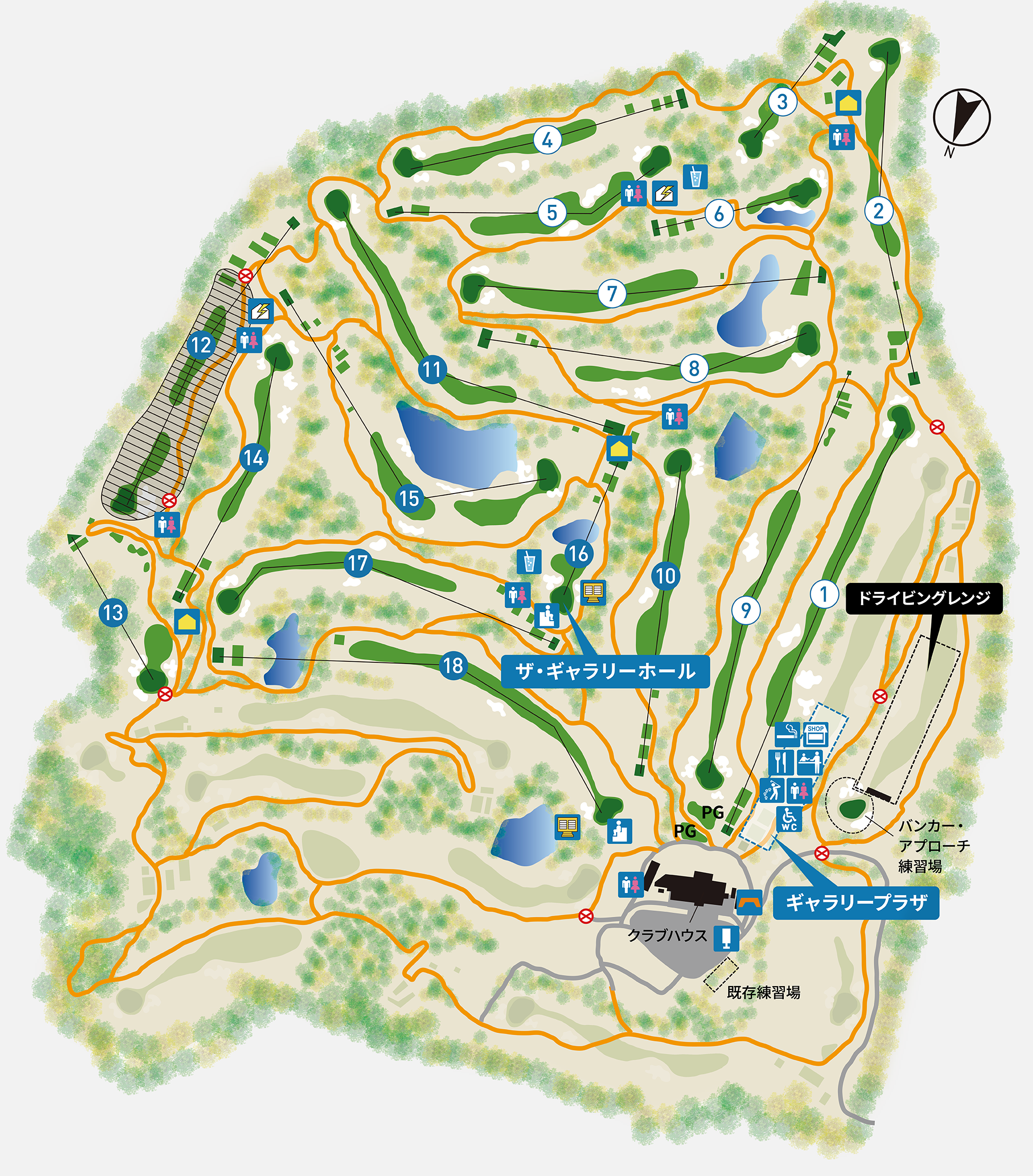 通常営業はパー5のホール。487ヤードのティイングエリアを使用しているので、その後ろのバックティから選手の豪快なティショットが見やすくなっている。ティショットはやや右目に打ち、コースをショートカットして、打ち上げの2段グリーンをできるだけ短い距離のセカンドショットで狙いたいホール。