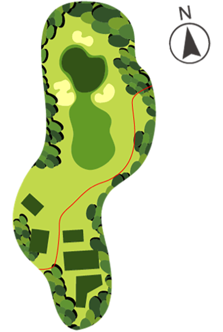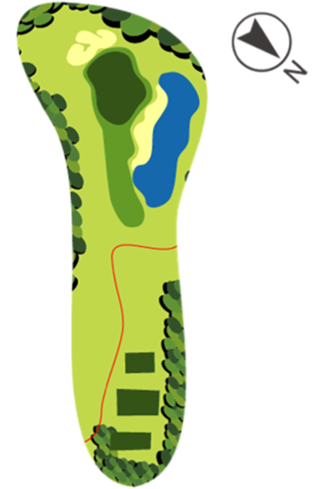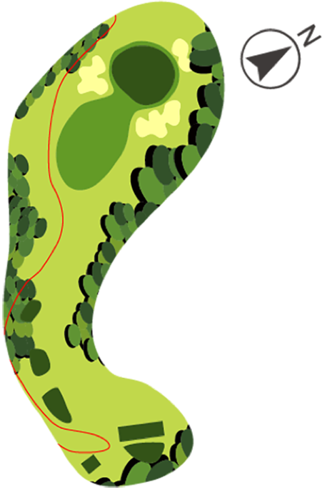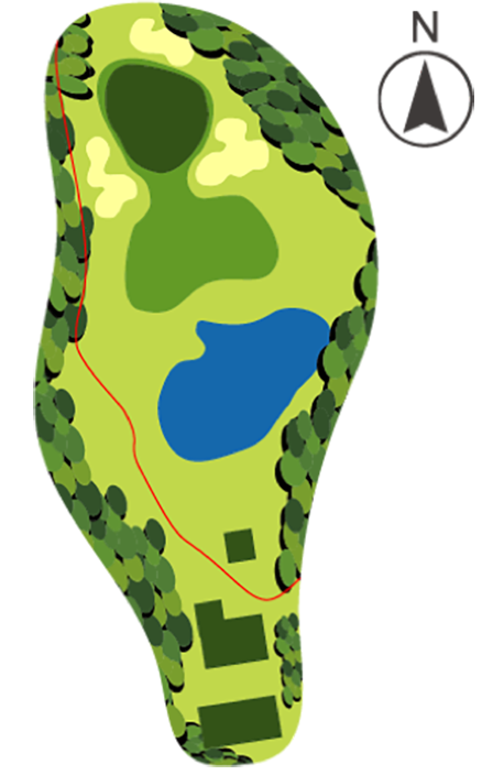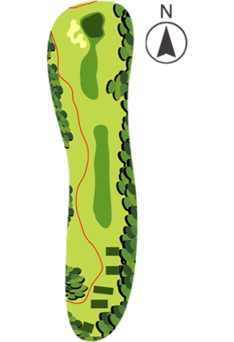 まずはティショットで左右ともOBを警戒。特に右はOB側に下っているので注意が必要。打ち上げとなる左右に長いグリーンであるが、比較的フラットな形状なのでロングパットでも狙いやすい。
