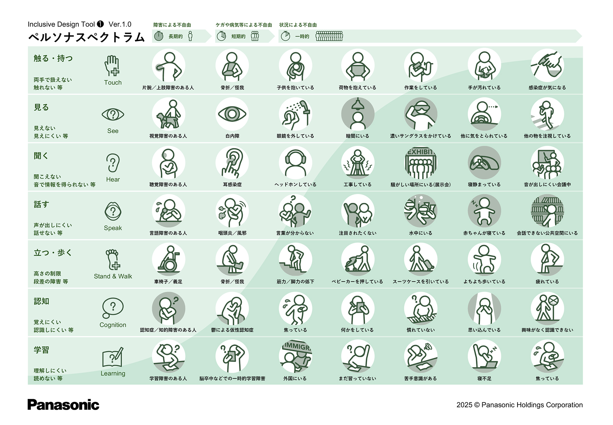 パナソニックのあたらしいやさしさに必要な5つの行動指針のうち “Overarching” にあたる、『一人のためのアイデアから、すべてのひとの生きやすさの実現を目指す』を理解し、使いこなせるようにするためのツールです。多様な人の状況をイメージしやすくするため、人が制約を受けている状況を『動作の共通点(触る・見る・聞くなど)』と『制約の種類(障害など長期的な制約のある人、一時的にその状況にある人、など)』でまとめています。