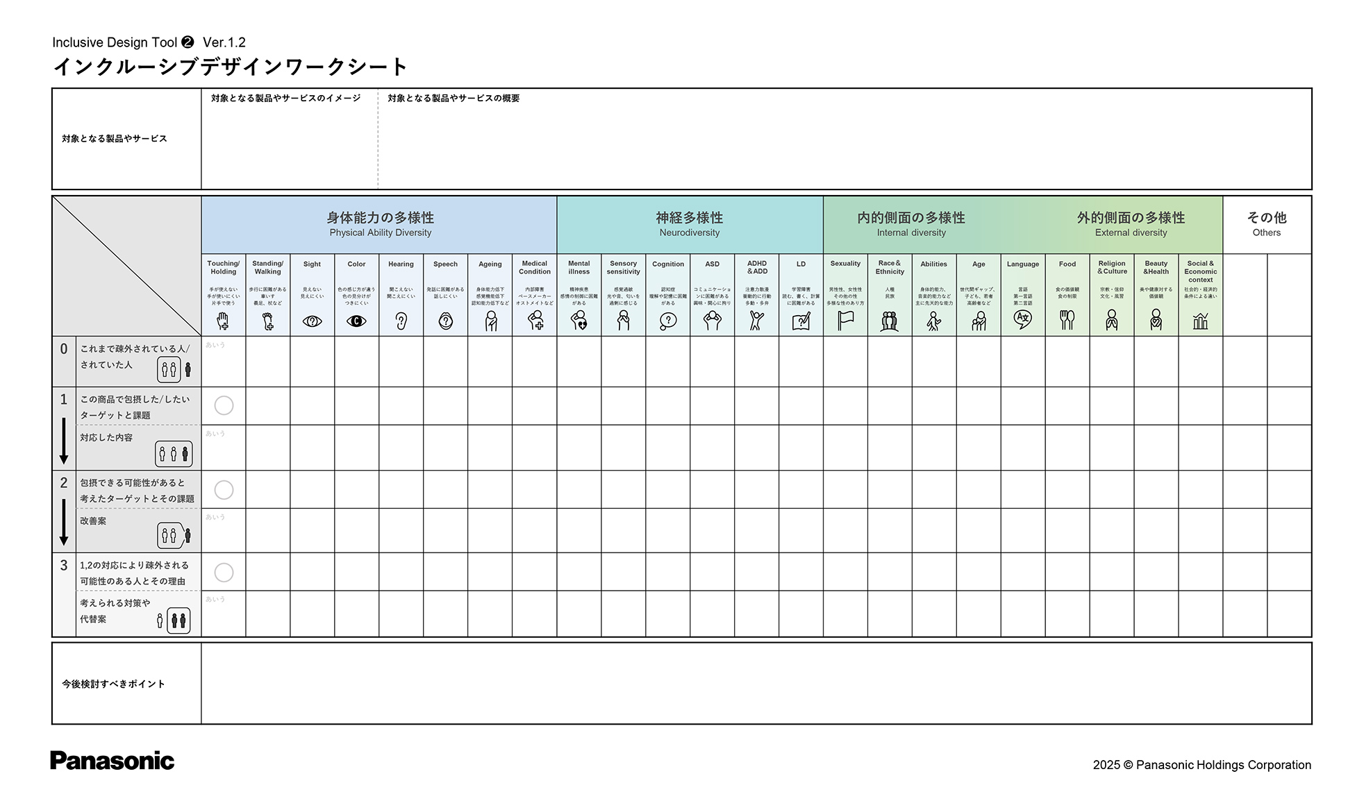 「パナソニックのあたらしいやさしさに必要な『5つの行動指針』における “Insight” にあたる、『常に見落としていること、聴こえていない声があることに気づくようにする』を実践するためのツールです。見落とされがちな困りごとや声を意識するため、想定ユーザーの範囲を広げて検討できるよう設計されています。