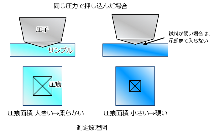 今回は各社の家電製品に使用されている金属部品の硬さを調べた結果を紹介いたします。硬さの評価方法としては、ブリネル硬さ測定、ヌープ硬さ測定などがありますが、今回は部品の厚みが1mm程度と薄く、その他の圧子では小さな試験片での評価が困難となることから、マイクロビッカース硬度測定を選択いたしました。ちなみにビッカース硬度測定とは、ダイヤモンド製の圧子を一定の加重で試料表面に押し込み、その際に形成される圧痕の面積を調べることで、物質の硬さを調べる評価手法です。