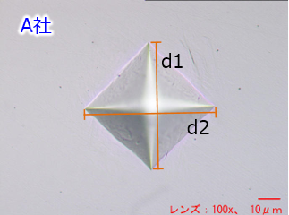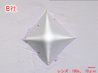 実際に圧痕が形成された試料の写真を以下に示します。両試料ともに、ほぼ正方形の圧痕が形成されており、適正にビッカース硬度を算出することができます。また、A社の方が圧痕の面積が小さく、B社に比べて、ビッカース硬さが大きく算出されております。