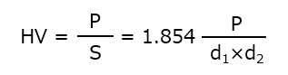 ダイヤモンド圧子を試料に押し込み、その際に形成された圧痕の表面積(S)は対角線の長さd1およびd2から算出することができます。この時に押し込み荷重(P)をくぼみの表面積(S)で割った値が、ビッカース硬さ(HV)です。