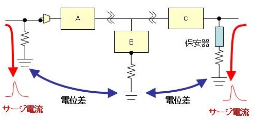 一方、欧米などは一箇所で接地し、その接地点からアース線を送ってゆく方式(TN接地)のため、アース線にサージ電流が流れた際、システム全体の接地電位は上昇しますが、機器のポート間に発生する電位差は抑えられます。