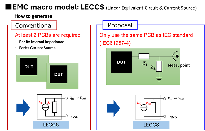 この研究は、半導体の部品置き換え時のEMC等価性を証明する際に、製品搭載時のEMC性能への影響を推定する技術の基礎をなすという位置づけで実施されてきました。この基盤技術によって、特に自動車業界を先駆けとして、部品置き換え時のEMCにおける再設計・再評価の工数を削減するほか、製品のEMCにおけるMBD(Model Based Development:モデルベース開発)の加速に貢献することが期待されます。