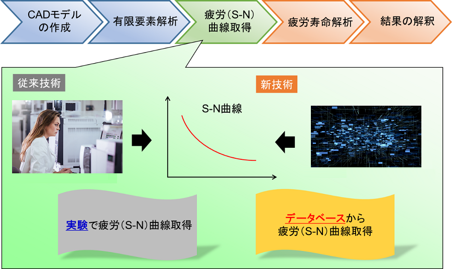 そこで、試験レスで疲労寿命の予測ができる「疲労寿命シミュレーション技術」をご紹介します。この技術を活用していただくことで、在宅勤務をしながら試験レスで疲労寿命を予測することができます。従来は、解析に必要なパラメータである疲労曲線(S-N曲線)は疲労試験を行うことで取得していました。しかし今回は、試験に頼ることなく、プロダクト解析センターが保有するデータベースを活用することで解析に必要なパラメータを提供させていただきます。これによりオール試験レスで疲労寿命シミュレーションができるようになりました。