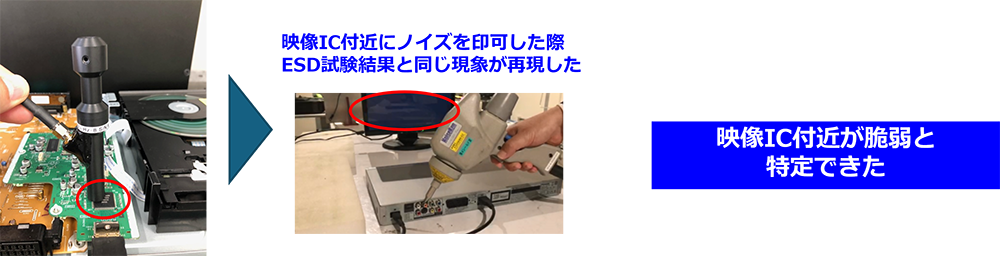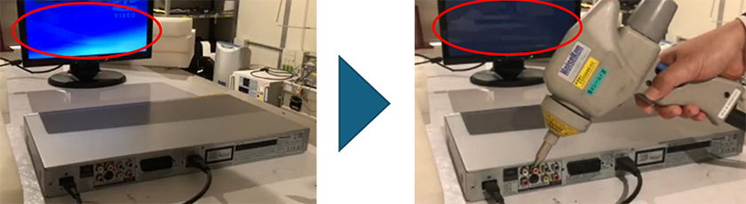 基盤・回路構造から、ハンディタイプのノイズ印可装置を使い、誤動作現象(映像が消える)が再現する箇所を洗い出します。
