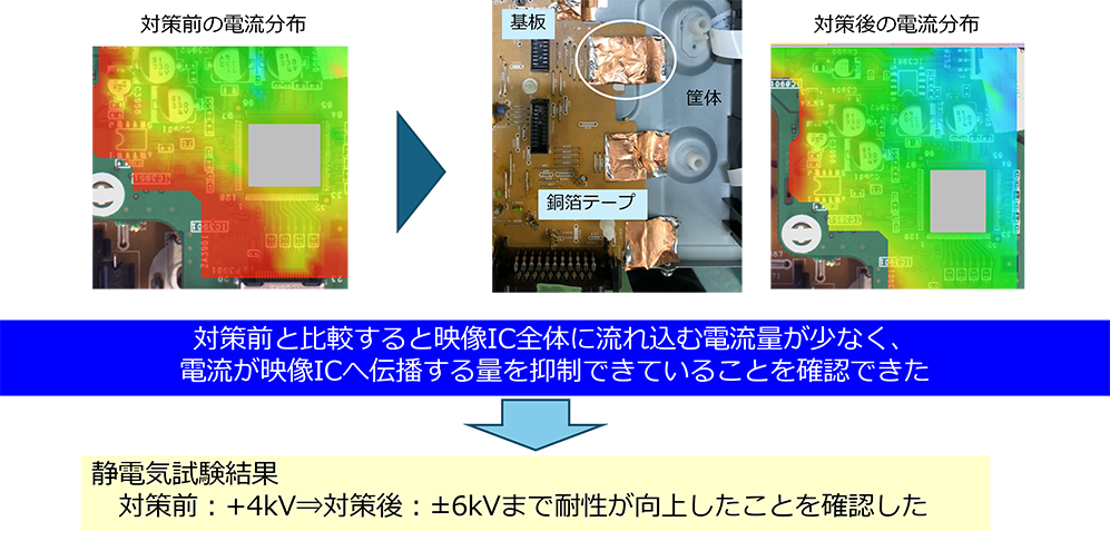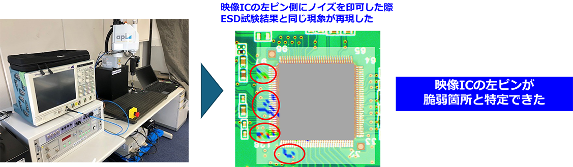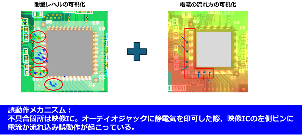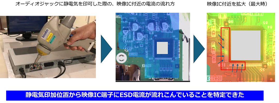 誤動作が発生した印加箇所から、STEP1で特定した映像IC付近に流れる電流を可視化する。