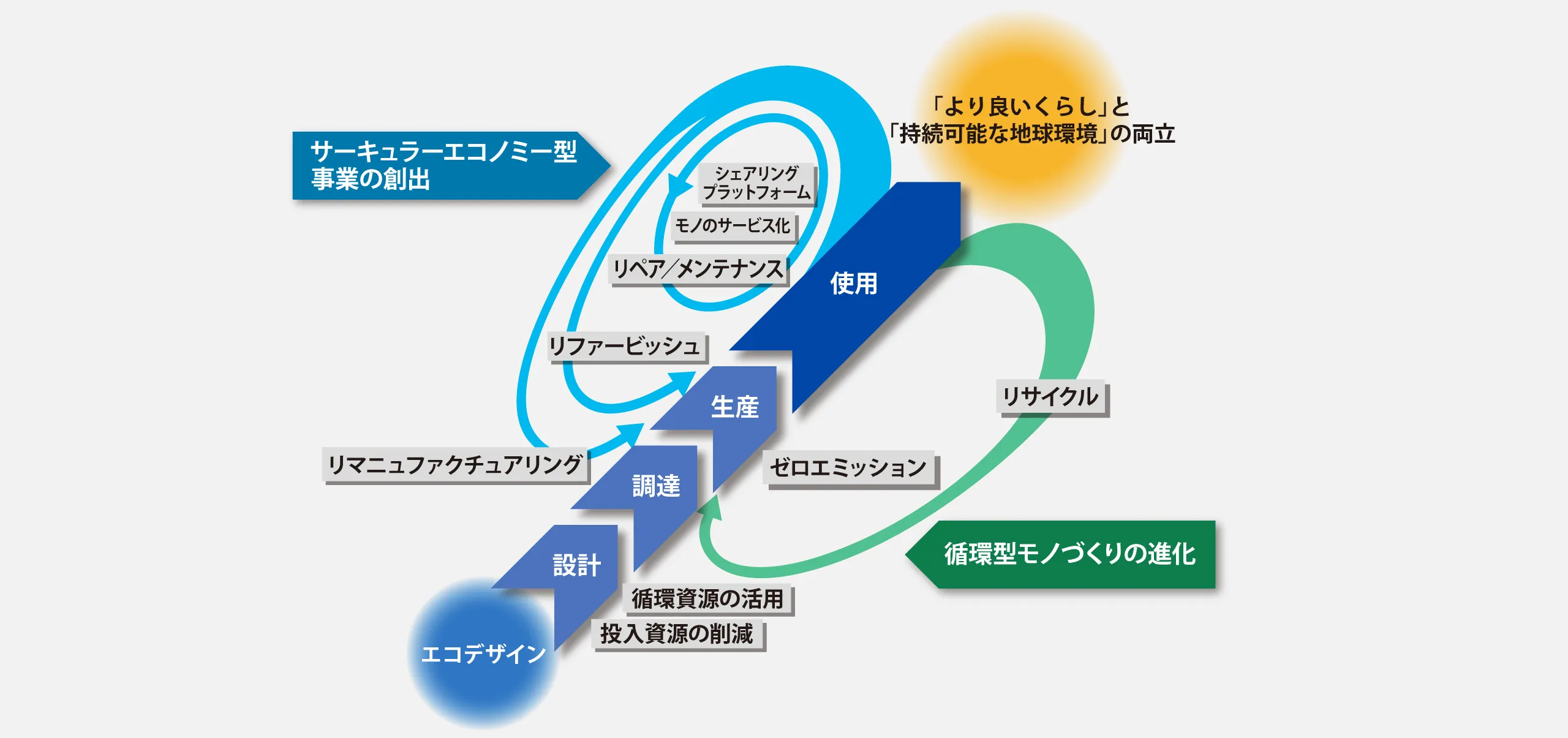 一つの製品を多くの人と共有する「シェアリングサービス」、機能をベースにしてサービスを充実させる「モノのサービス化」、製品そのものや製品に使われている部品を再生・再利用し、その機能・価値・ 寿命を最大限に活用する「リペア/メンテナンス」「リファービッシュ」「リマニュファクチュアリング」などといった事業の創出に挑みます。