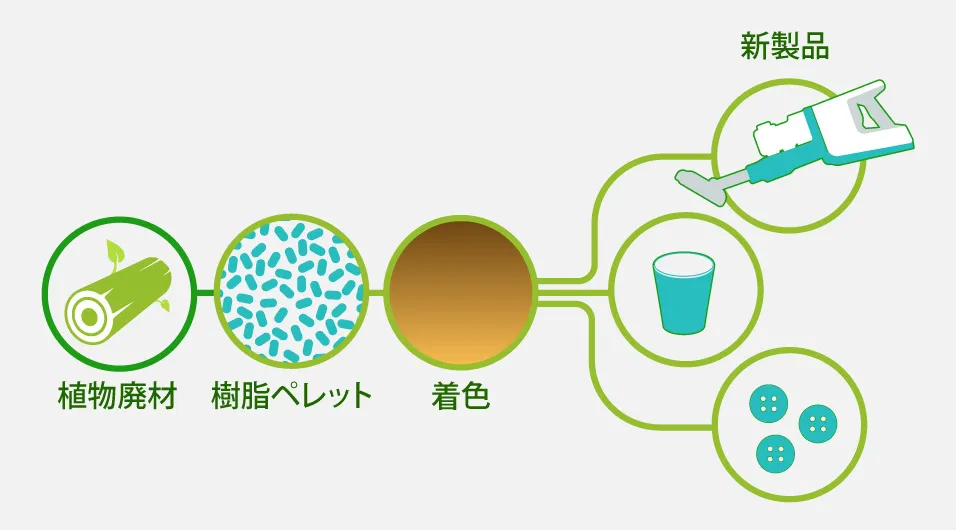 このセルロースファイバー樹脂は、企業や自治体などとの共創によって、環境配慮型のリユースカップやボタンなどに活用され始めています。