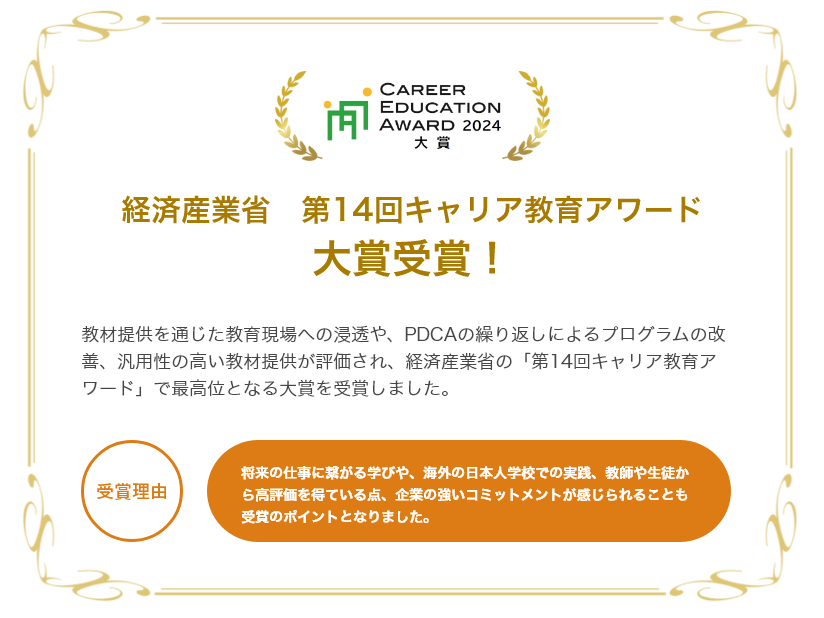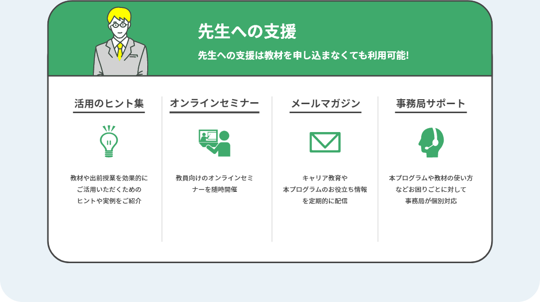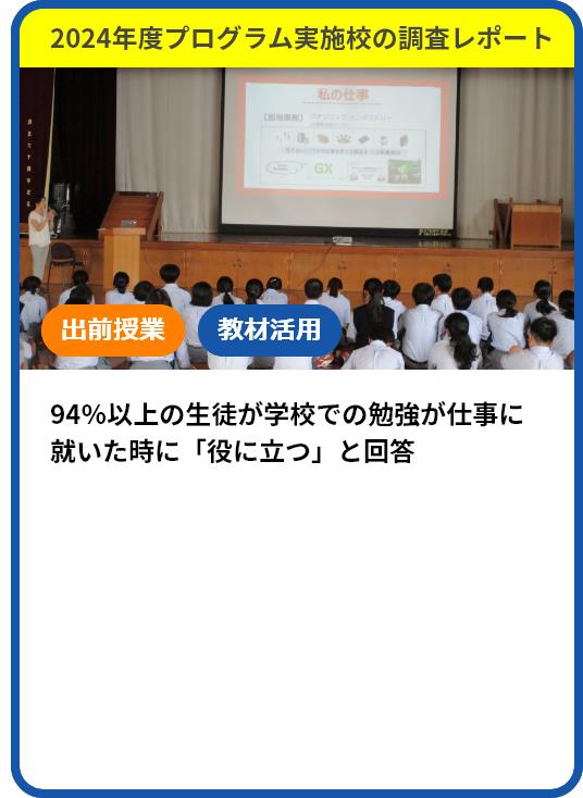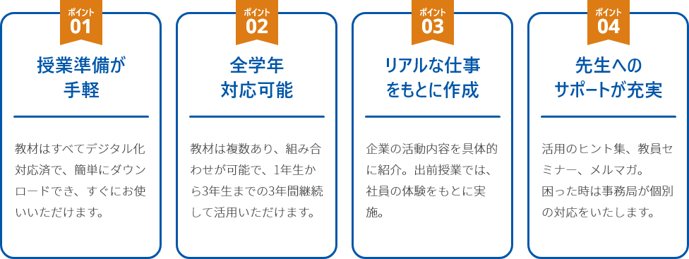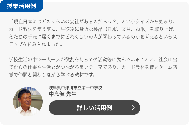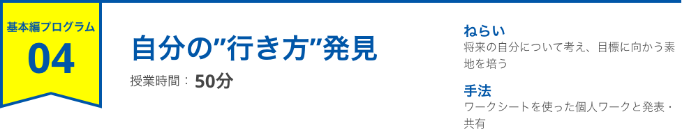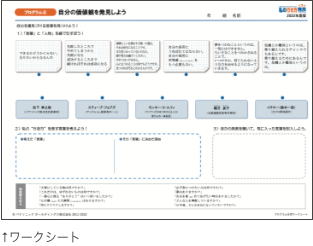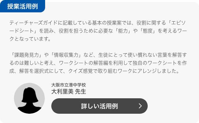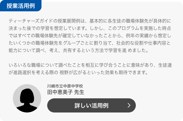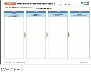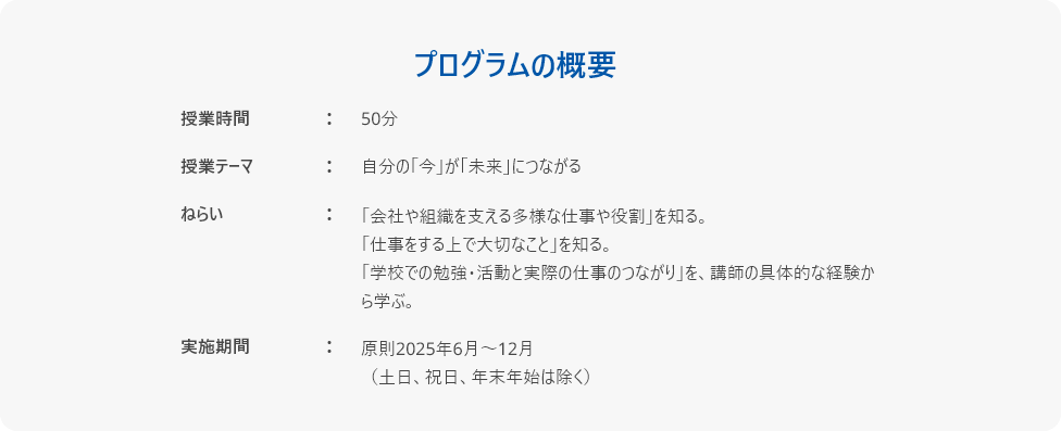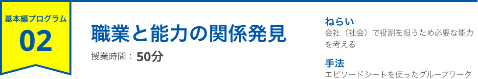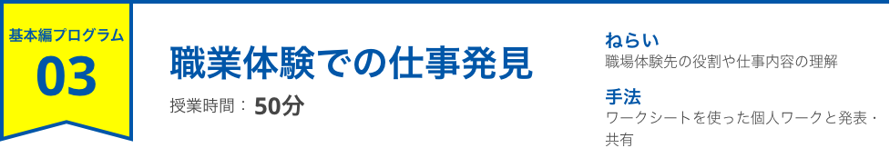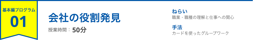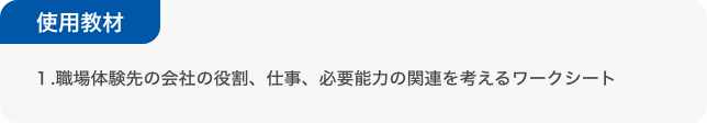 主なねらいは、会社には社会的な役割があることやその社会的な役割を一人ひとりが果たすことの大切さを理解すること。職場体験の事前学習として最適。中心となる学習活動は、自分の職場体験先の社会的な役割、仕事内容その仕事と能力との関係について考える個人ワークのプログラム。