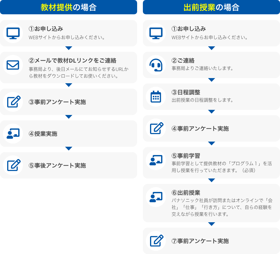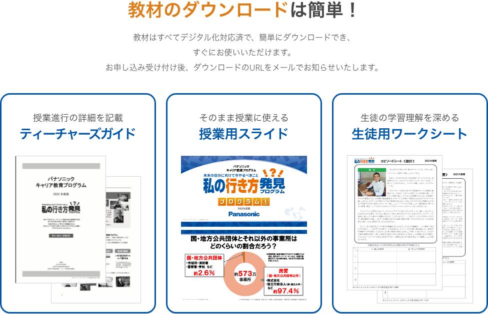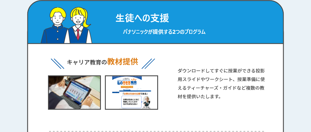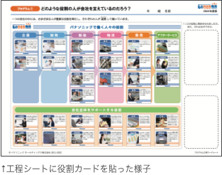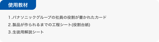 主なねらいは、社会には多様な職業・職種があることに気づき、それぞれの役割の人が連携しながら会社(組織)が成り立っていることを理解すること。パナソニックグループで働く人の役割カード30種類を工程ごとに分類し台紙に配置するグループワークのプログラム。
