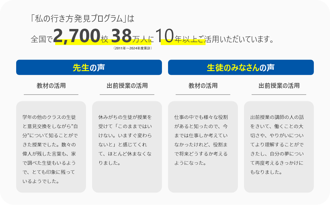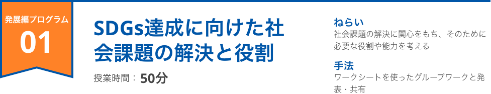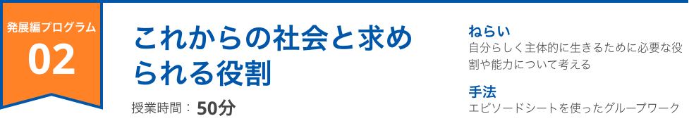 主なねらいは、社会課題の解決に関心をもち、そのために必要な役割や能力を現在と紐づけて考えること。