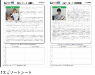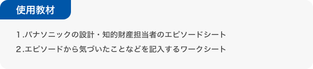 主なねらいは、会社(社会)でそれぞれの役割を担うためにはどのような能力が必要なのかを考えること。「家電製品をつくる人々に必要な力」について、「設計」と「知的財産」の2つの職種を取り上げ、その仕事に従事する社員の「エピソードシート」から、それぞれの役割に必要となる能力を読み取るグループワークのプログラム。
