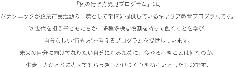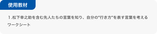 主なねらいは、自分の価値観を知ること。パナソニックの創業者である松下幸之助の“行き方”や先人の言葉から自分の価値観を導き出し、将来の自分について考える個人ワークのプログラム。