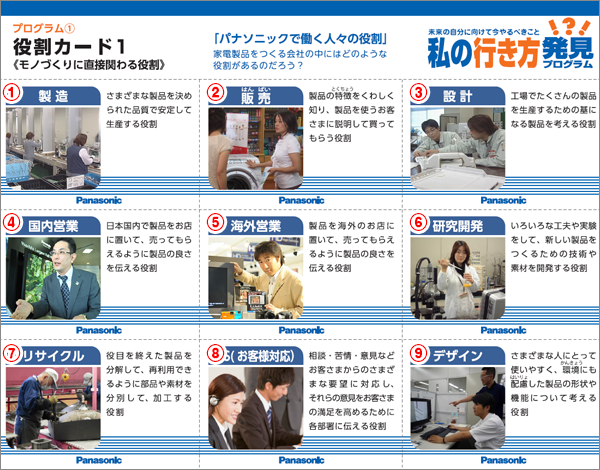 - プログラム後半のグループワークでは、家電製品をつくる会社の中に、どのような役割があるか、「役割カード」の分類を通して理解させます。