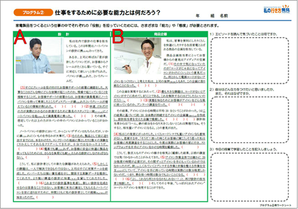 - ティーチャーズガイドに記載している基本の授業案では、「設計」「商品企画」の役割に関する「エピソードシート」を読み、役割を担うために必要な「能力」や「態度」を考えるワークとなっています。