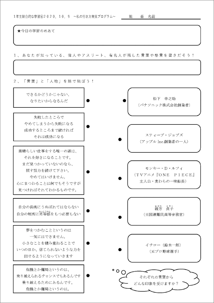 昨年度この教材を活用した1年生の生徒たちは、自己の“行き方”について考えることができましたが、 今年度の1年生も総合的な学習の時間のキャリア教育教材として「私の行き方発見プログラム」を活用したいと思っています。