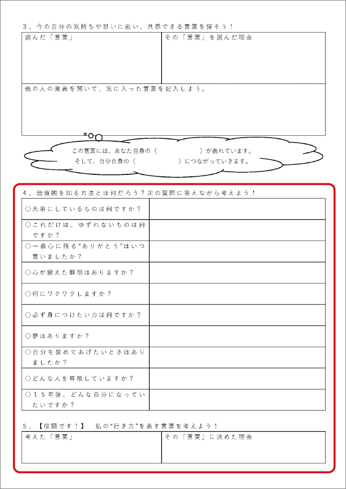 〇自分の“価値観”を考えやすいようにワークシートを独自でアレンジ