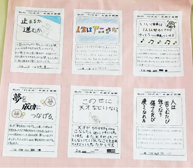 プログラム④は、ワークシートをアレンジして活用しました。具体的には、「自分の価値観を知る方法」の中で、参考となる先人の言葉を学び、自分の考えをまとめ、言葉を導き出しやすくするために、ティーチャーズ・ガイドに記載されている10題の質問例を追加し、回答欄を設けました。生徒たちが、質問に答えていくことにより、自分が大切にしている価値観について考え、その結果、一人ひとりが「自分の行き方」として、「言葉」とその「言葉に込めた理由」を考えるきっかけになりました。
