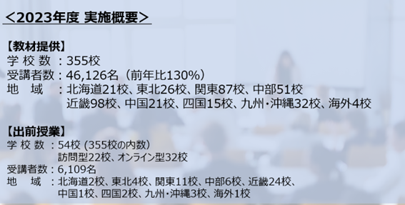 「私の行き方発見プログラム」は2011年度に活動を開始し、これまで2,253校に教材を提供、そのうち391校で出前授業を実施して参りました。2023年度までの総受講者数は344,005名に達しています。