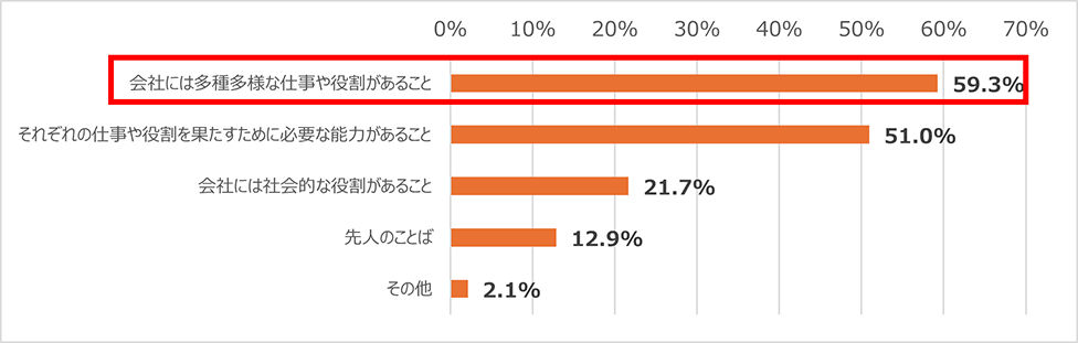 ■プログラムの内容で特に印象に残ったことは「会社には多種多様な仕事や役割があること」で、活用度が高いプログラム①のテーマと合致する。