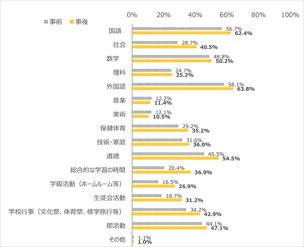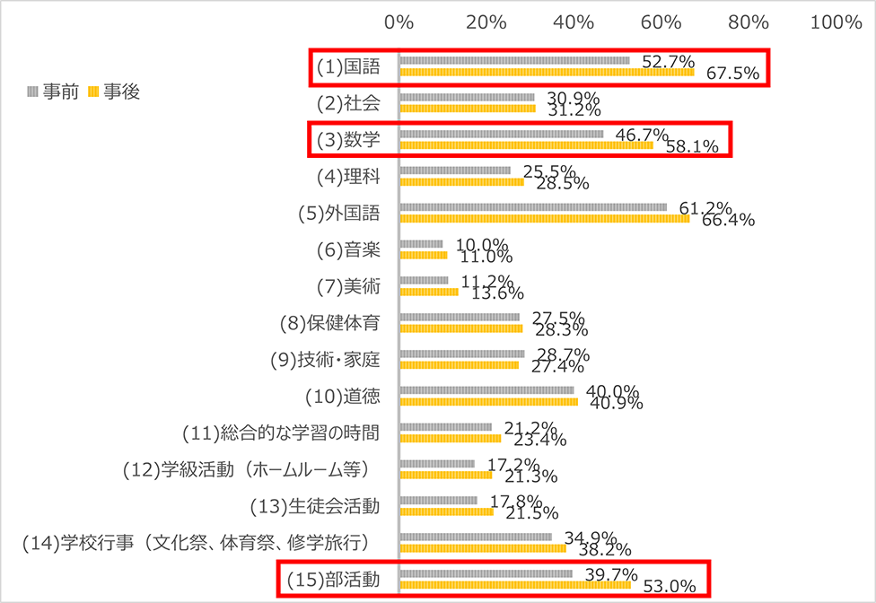 ■具体的に役に立つ「国語」15ポイント、「数学」11ポイント、「部活動」13ポイントと増加率が高かった。いずれも授業スライドで取り上げた科目であることから、授業の影響の大きさがうかがえる。