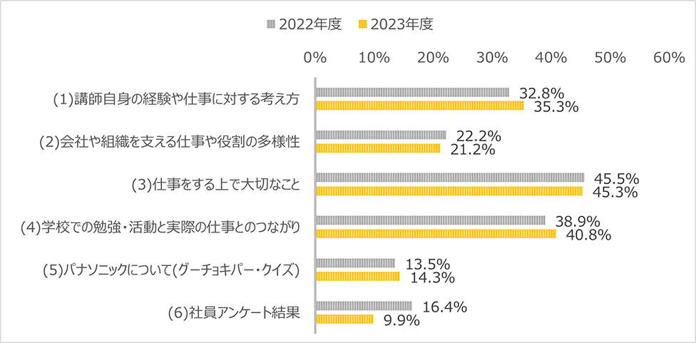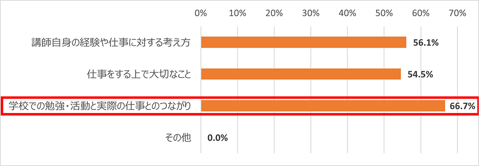 ■生徒たちに参考になったと思われることでは、「学校での勉強・活動と実際の仕事とのつながり」を挙げた先生が多く67%だった。「自分の今が未来につながる」という出前授業のテーマが伝わったと思われる。