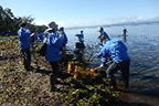 美しい猪苗代湖の水質環境を守るため、浜辺に打ち上げられた漂着水草の回収に取り組んでいます。10年以上前から近隣の大学や住民とともに、パナソニック インダストリー労働組合郡山支部を中心にパナソニック労働組合福島地区の従業員とその家族が参加しています。