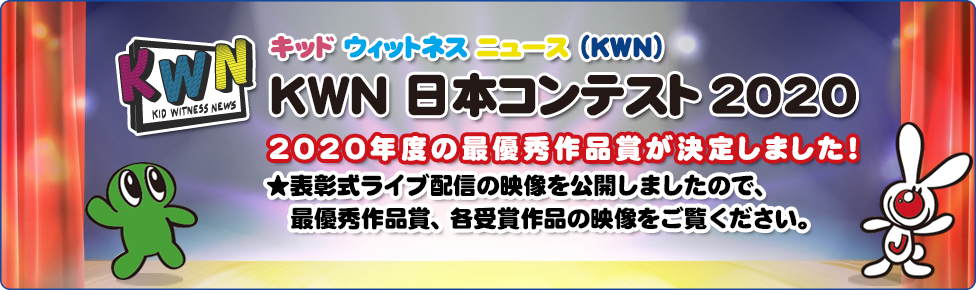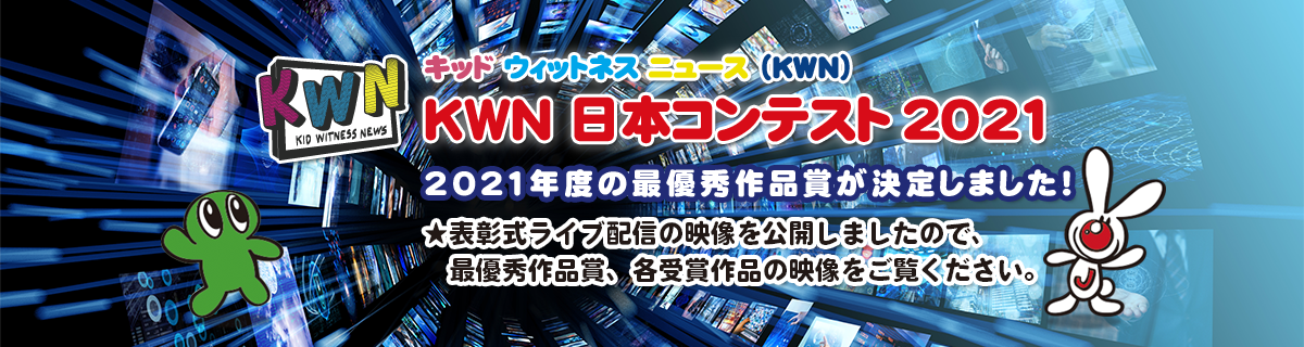 キッド・ウィットネス・ニュース(KWN)日本コンテスト2020の受賞作品を決定し、3月14日(日)にオンラインでコンテスト表彰式を開催しました。今年度は、日本全国から小学校・中学校・高等学校75校・120チームが参加し、厳正な審査の結果、SDGs賞など10作品の部門賞と、佳作21作品が選出され、さらにその中から、森村学園初等部「桜隠し」、福島県いわき市立平第三中学校「2030年エネルギーの旅」、福島県立いわき光洋高等学校「はなことば」の3作品が最優秀作品賞に決定しました。なお通例は、コンテストの結果を表彰式にて公表しておりますが、昨今の新型コロナウイルス感染症の感染拡大リスクが続いていることを鑑み、本年度も入賞校の皆様および関係者の健康面を考慮して、オンラインでの表彰式としてYouTubeライブ配信で開催いたしました。