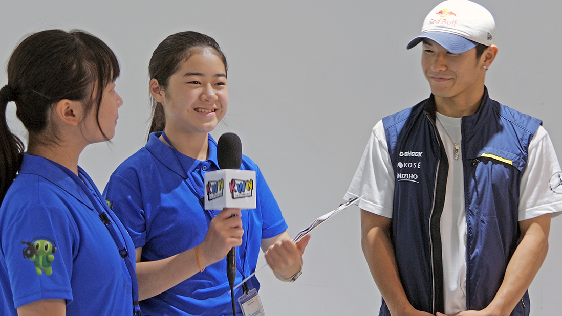 放送部の生徒たちは、事前にオンラインでレクチャーを受けながら、当日はアナウンスに挑戦。緊張しながらも落ち着いたアナウンスを行い、選手から「いいね!」と声をかけていただきました。参加した生徒たちは、当日のレポート番組制作にも挑戦します。完成を楽しみにしています。