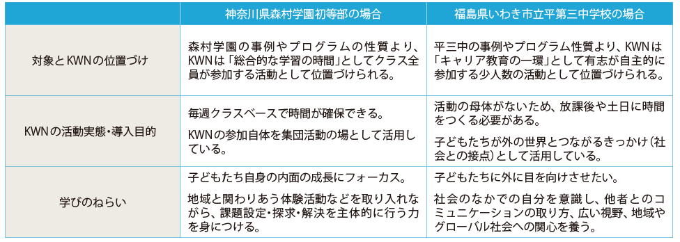 KWN の実施方法は、学校によって、有志の活動、クラブ活動から学校単位での参加まで、多様である。こうした異なる方法で実施されたプログラムに対して、同一の基準の評価を実施し、その結果を比較することにより、効果的なプログラム実践のためにはどのような参加形態、指導手法、役割分担が有効であるかについて検討をすることができる。