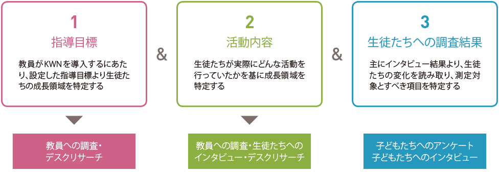 また、これらの評価結果をもとに、プログラムを実施した教員・学校間でこれからの内容を共有し、KWN 事業実施の方法等の交流活動を行うことで、より効果的なプログラム運営についての学びあいが実施できる。