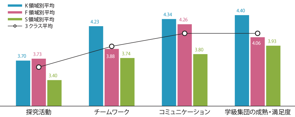 評価仮説を立てた4つの領域のうち、3つの領域においてKWNを実施したK組が高い数値を示す結果となりました。