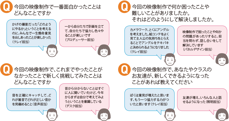 プログラム実施が学級集団としての成熟に寄与していることも読み取れました。学級集団の成熟3 について自ら動けるようになったなどの主体性に対する回答や、挑戦し達成感を得たなどの回答もあり、映像制作の過程の中で多様なことに新しく挑戦している子どもたちの姿が読み取れました。