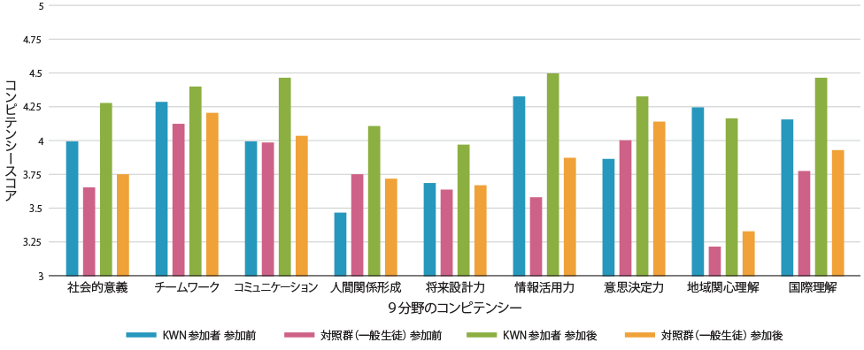 KWN 活動に参加した生徒の成長はコンピテンシー(高い成果につながる特徴的な行動特性)スコアの向上によって裏付けられた。とくに「人間関係形成」「コミュニケーション」「将来設計」の各項目においては、活動に参加していない一般の生徒よりも大きな成長を見せている。