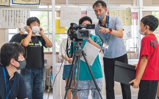 ビデオカメラやマイクなど、実際に撮影機材を使いながらの講義。撮り⽅についての注意点や撮影前の機材の調整⽅法、カメラの取り扱い⽅、アングルの決め⽅など⼀つひとつ解説。「パン」「チルト」「アイ・アングル」「ロー・アングル」といった専⾨⽤語を使いながら、具体的な撮影テクニックも解説していきます。ひと通り説明が終わった後は、⼦どもたちも前に出てきて、撮影のデモンストレーションを⾏います。