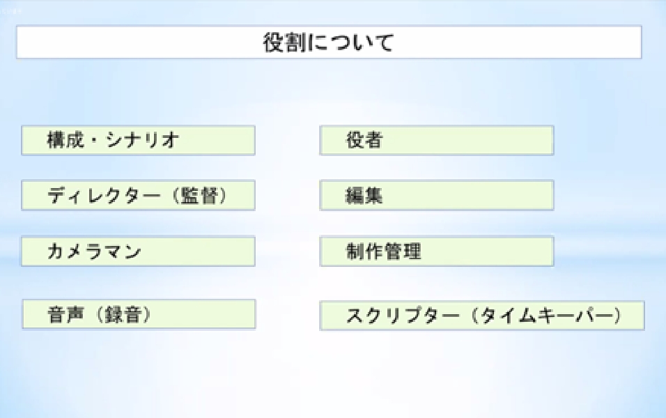 映像を制作するにあたり、どんな役割があり、それぞれどんなことをするのかを解説します。実際のスタッフ構成を⼦どもたちに割り振り、体験してもらうことで学びのへの理解度が深くなります。個々の役割について皆さんで考えて、映像制作に関わる全体像を把握することが出来ます。
