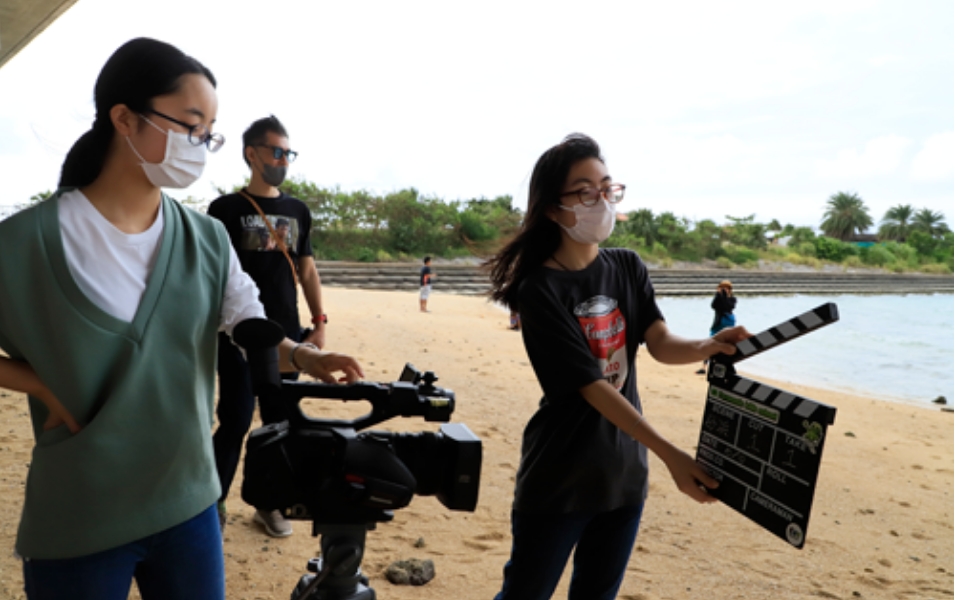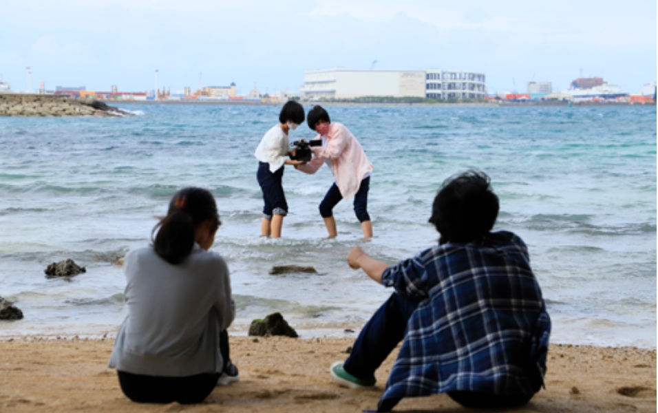 KWN常連校である沖縄県・昭和薬科⼤学附属⾼等学校・中学校。実際に撮影をスタートするにあたって、さまざまな疑問や課題が⽣じたという同校の依頼により、作品制作途中でのワークショップを実施しました。当⽇はロケ現場に映像講師が訪れ、撮影アングルや演出⽅法、シナリオについてなど、その都度、⽣徒たちから出たさまざまな質問に回答。ただ教えるのではなく、⽣徒たち⾃らが「考える」ことを主眼に置いた指導法で、参加者全員が課題を再認識し、解決の⽷⼝をつかめるよう務めました。時に厳しくも優しい講師の叱咤激励に、⽣徒たちは皆、コンテンスト作品制作に対する意気込みを新たにしました。