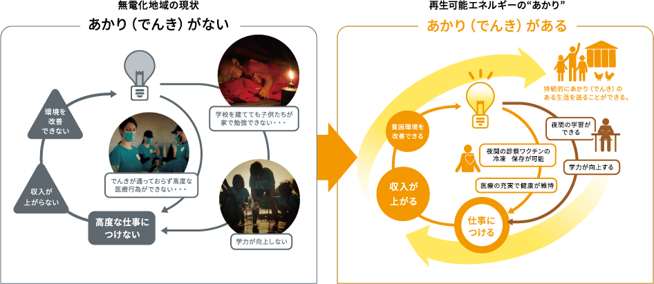 「あかり」と「でんき」を提供し、それが教育・健康・収入向上につながる