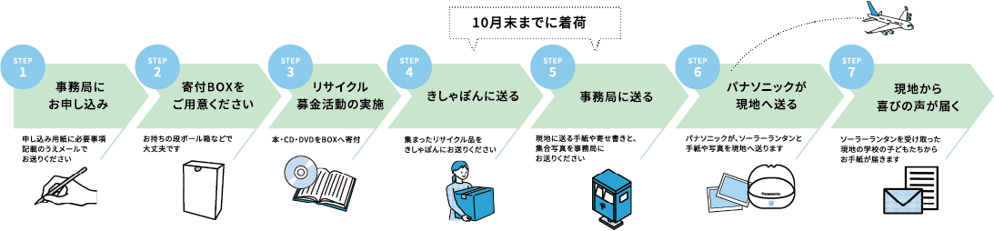 - 集めたリサイクル品(本・CD・DVD)をリサイクル業者(きしゃぽん)に、無電化地域に住む子どもたちへの「手紙」や「寄せ書き」と「参加メンバーの集合写真(簡易なもの)」を事務局にそれぞれ10月末までに着払いで着荷させてください。