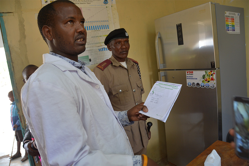 データを見せながら説明する看護師、後ろの冷蔵庫は政府から支給されたもの